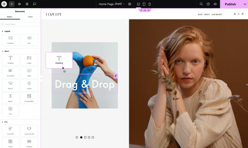 Create custom headers, footers, and page layouts directly inside Elementor.